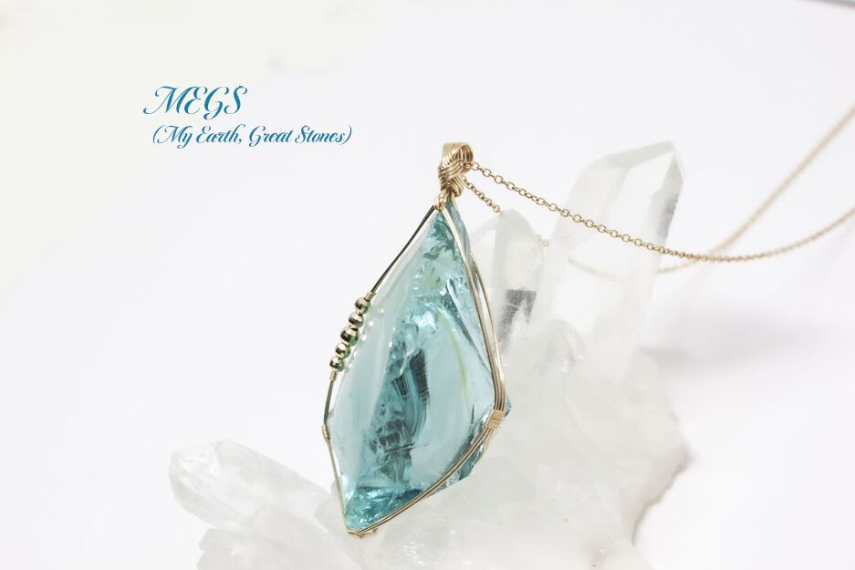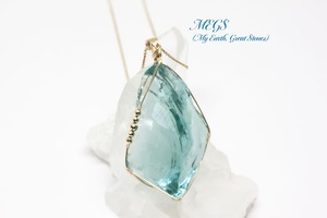流れる波の様なアンダラクリスタルのターコイズブルーを繊細ワイヤーアートジュエリー女神巻き®でペンダントトップに致しました。