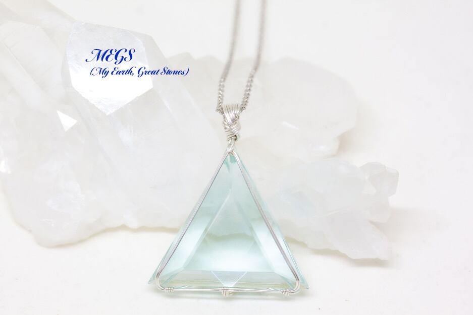 海の様な色合いのアンダラクリスタル アクアブルートライアングルを繊細ワイヤーアートジュエリー女神巻き®でペンダントトップに致しました。