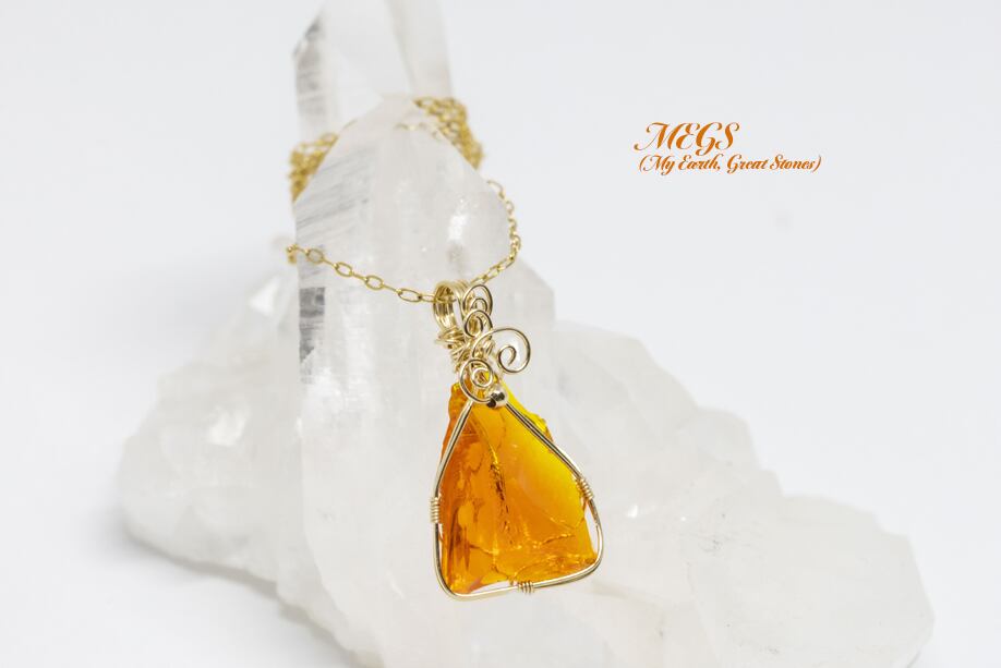 オレンジ・イエローのバイカラーのアンダラクリスタル レムリアンエスリウムゴールドをワイヤーで巻き上げました。