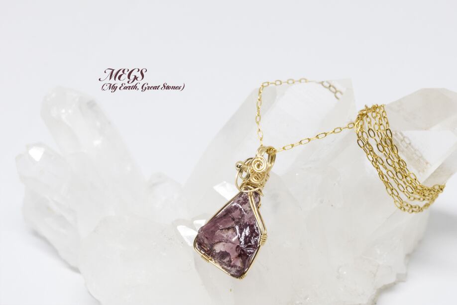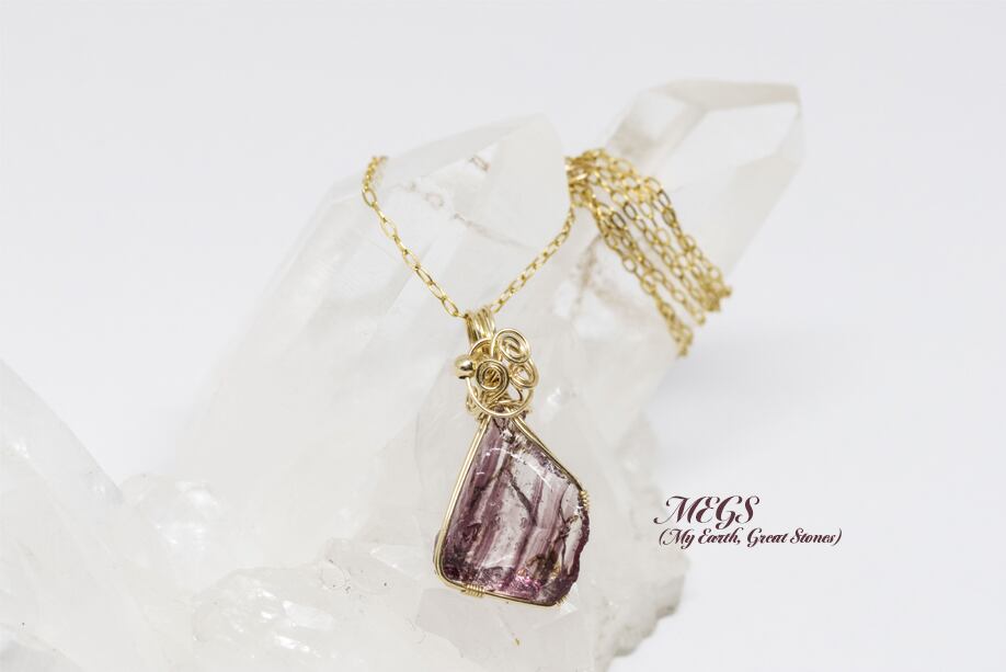 パープル・クリアのバイカラーのアンダラクリスタル レムリアンエスリウムゴールドをワイヤーで巻き上げました。
